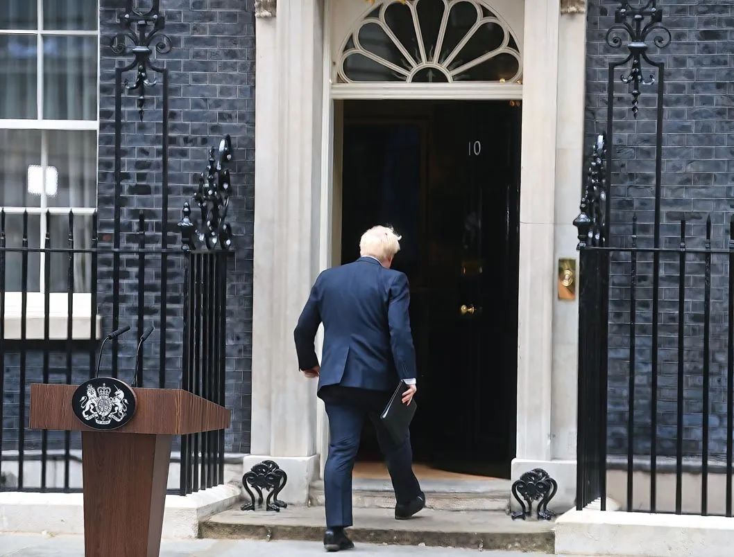 2022年7月7日,时任英国首相鲍里斯·约翰逊在伦敦唐宁街10号门前发表辞去保守党党首和首相职务的讲话后离开